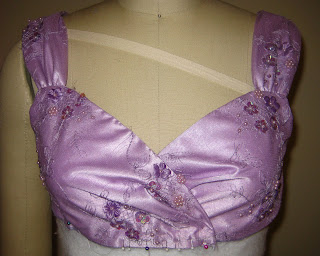 Since this is not really worn for a performance, it can be much more subtle, but I would want to be putting some darker amethyst coloured tiny rhinestones nestled somewhere within or close to the flowers.I have thought of that sort of a bodice for a ball gown and this lovely one is definitely making me put that close to the top of my list. Very pretty.